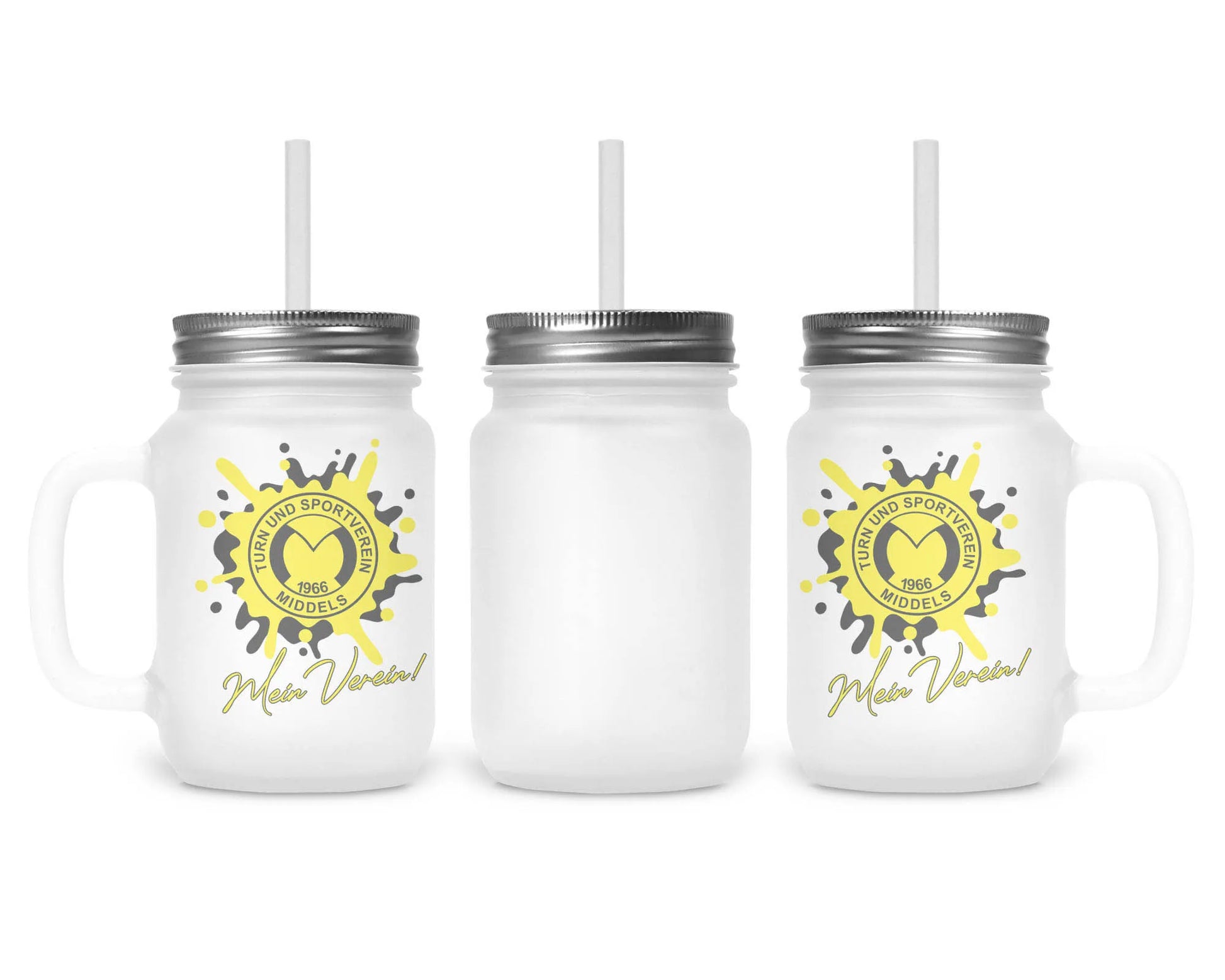 Mit unserem TuS Middels – Splash Edition Henkelglas stürzt du dich in jede Erfrischung mit maximalem Style! Das auffällige Splash-Logo ziert das satiniert-mattierte Glas – perfekt für Eiskaffee, Smoothies oder Limonaden. Der praktische Henkel und der wiederverschließbare Deckel mit Trinkhalm machen das Glas zum idealen Begleiter für Heimspiele, Gartenfeste und den Alltag.